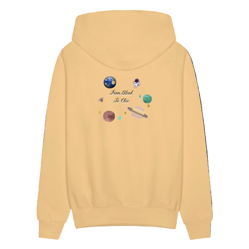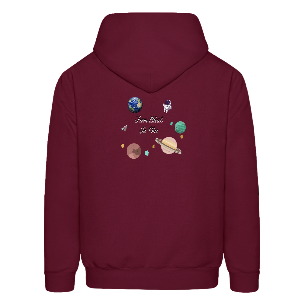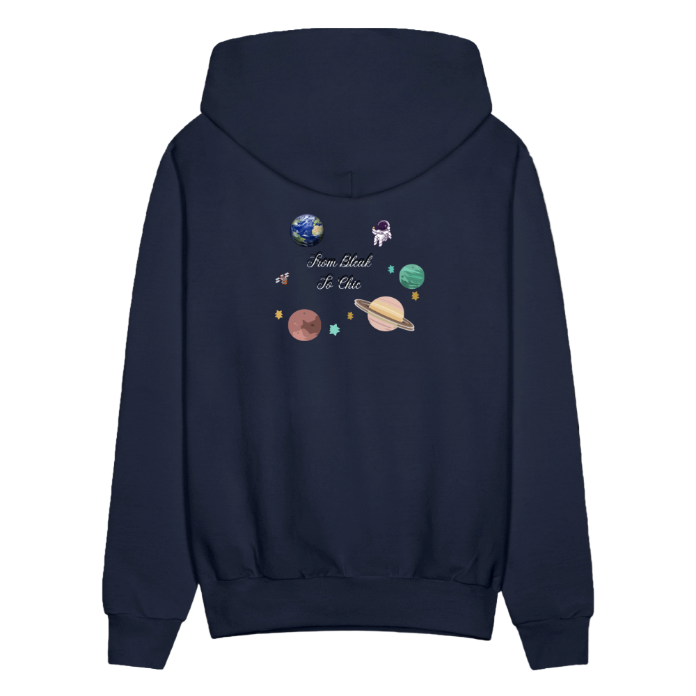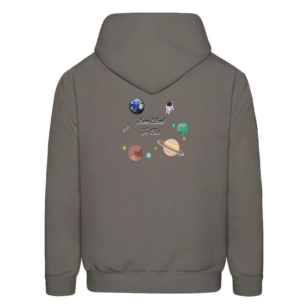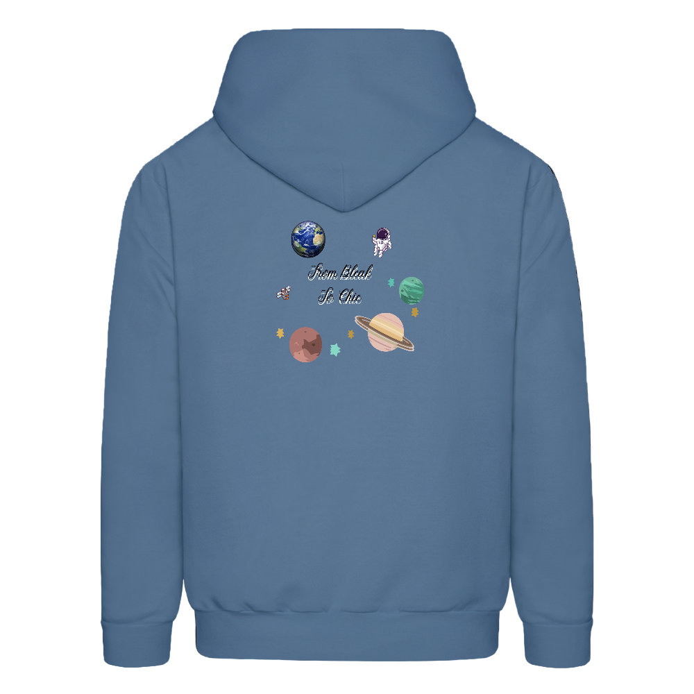 • Celestial Logo Design – Front crown logo + back planets, stars & astronaut art with “From Bleak to Chic” text.
