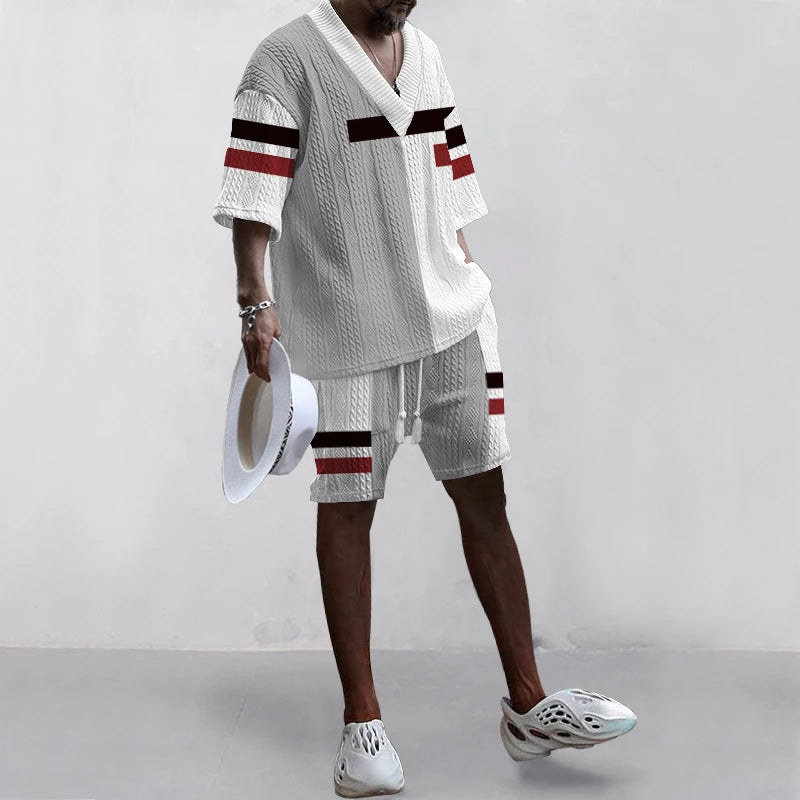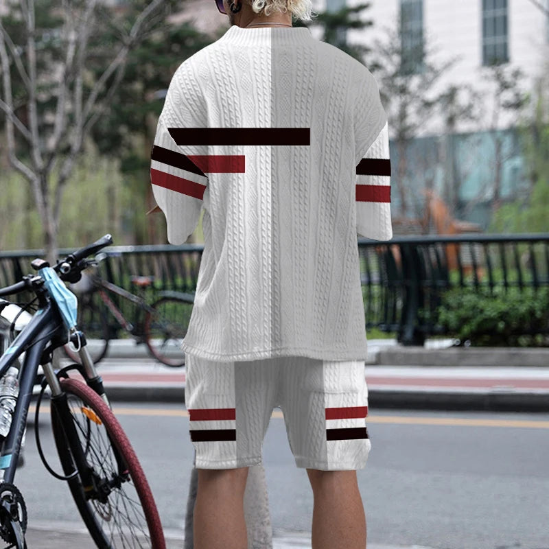 Step into refined edge with the Valverro StriLux Set—where bold design meets breezy comfort. This luxe two-tone matching set features a distinct asymmetrical shirt with one side gray, one side white, accented by sharp black and red stripes across the chest and half sleeves. The coordinating shorts echo the colorblock design with a mid-gray stripe, white side panels, and vertical stripe accents. Made from high-quality jacquard-textured polyester, this set delivers softness, moisture control, and durability with every wear. Ideal for seaside escapes, casual gatherings, or stylish getaways, it’s your new go-to for elevated everyday dressing.