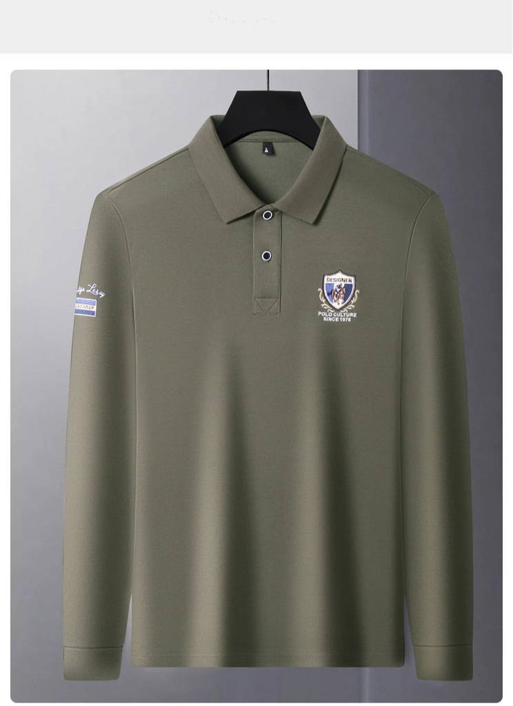 Command attention with the Equestrian Crest Designer Flip-Collar Polo for men, featuring a detailed shield embroidery of a polo player on a brown horse with custom lettering beneath. Its innovative flip collar reveals designer text and triple contrast stripes for a bold, sophisticated statement. Crafted from a premium cotton-poly blend, this long sleeve polo offers wrinkle resistance, vibrant color retention, and textured fabric for a luxe feel. Perfect for casual or upscale occasions, it pairs effortlessly with chinos, jeans, loafers, or sneakers. Available in eight luxurious colors, M–4XL, and built with high-end craftsmanship for lasting elegance.