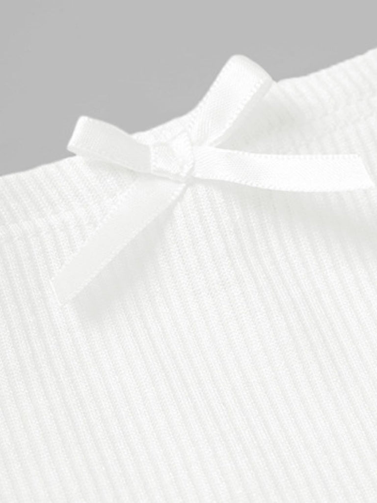 Close-up of White Rivéla Ruche Skirt front mini bow and ribbed textureClose-up of White Rivéla Ruche Skirt ribbed texture and stitched layered ruffles