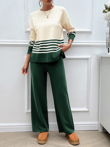 Devine Slit Striped Round Neck Top and Pants Sweater Set