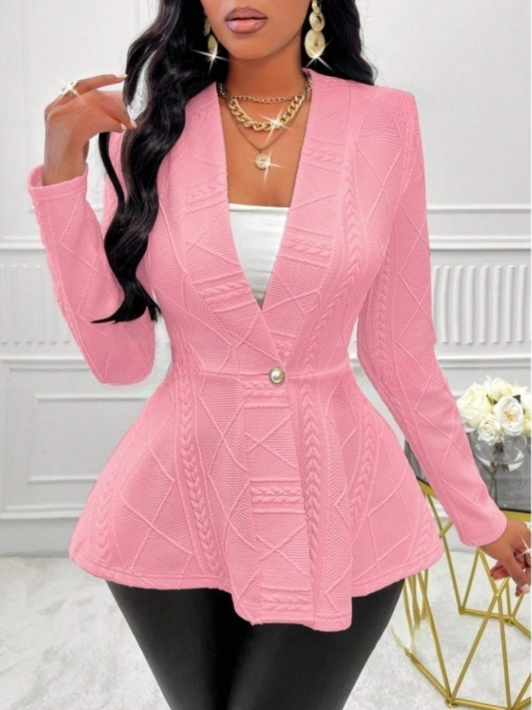 Elevate your layering collection with the One Button Textured Peplum Cardigan, a graceful fusion of structure and softness. Designed with a subtly flared peplum silhouette, this piece flatters the waistline while providing a polished, feminine finish.