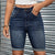 Side zoom-in on dark blue high wiast jean shorts showing slim fit and washed design.